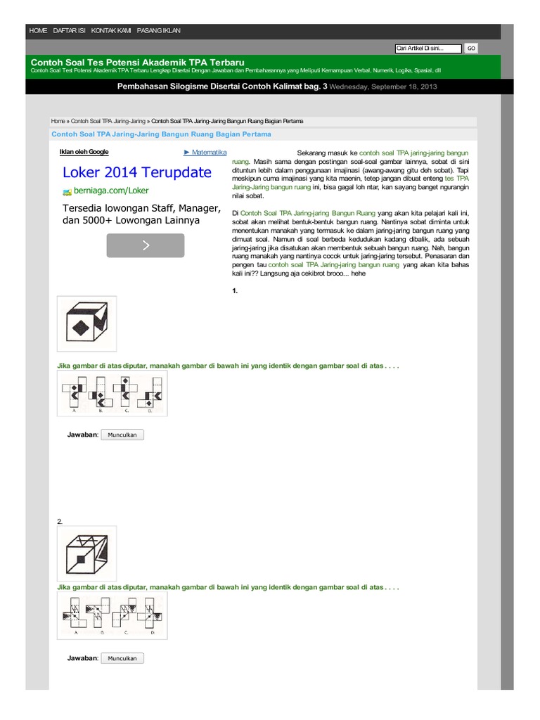 TPA yang mempunyai kepanjangan Tes Potensi Akademik adalah sebuah tes yang. Badan Perencanaan Pembangunan Nasional atau Bappenas secara intensif melakukan berbagai tes Dengan kisi-kisi soal ini dapat memudahkan Anda latihan atau berlatih soal-soal TPA Bappenas. Home » Bank Soal CPNS TIU » Contoh Soal CPNS - Tes Penalaran Analitis.